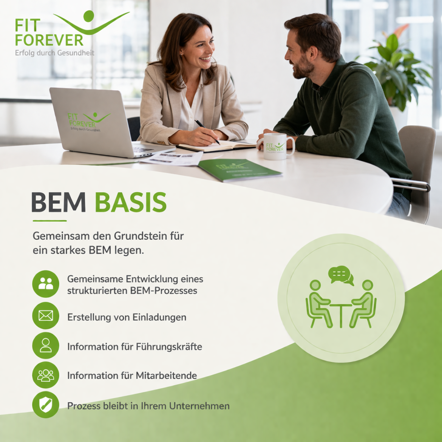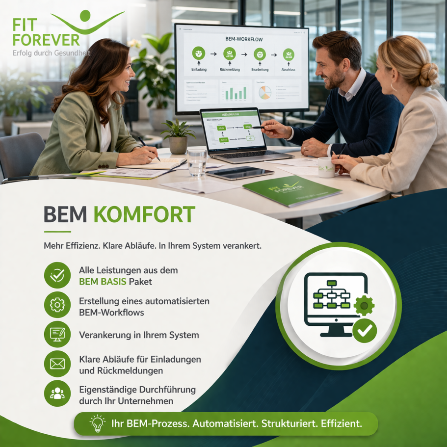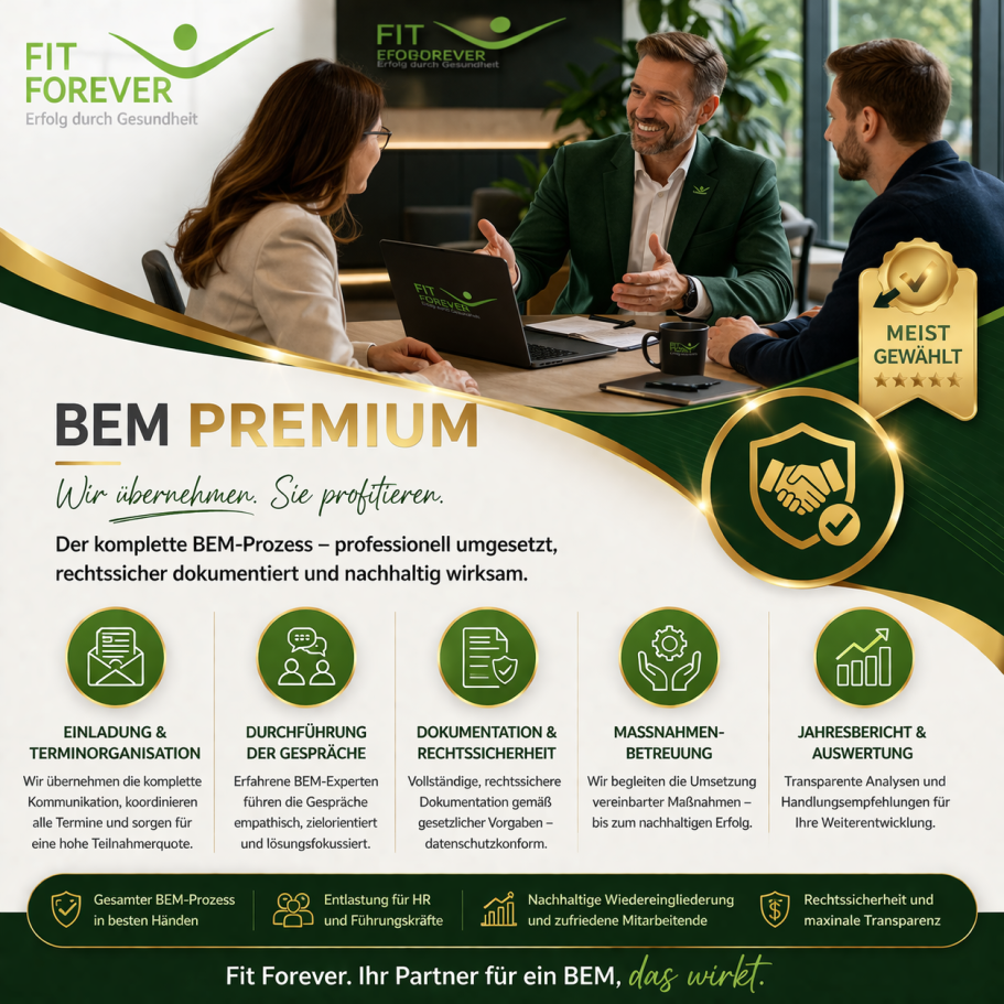 Unternehmen entscheiden sich für Fit Forever, weil der gesamte BEM-Prozess effizient ausgelagert werden kann und der interne Aufwand auf ein Minimum reduziert wird. Gleichzeitig erfolgt die Umsetzung rechtssicher und strukturiert nach den gesetzlichen Anforderungen. Durch klare Prozesse und vertrauliche Behandlung aller Daten wird zudem ein datenschutzkonformes Vorgehen gewährleistet.